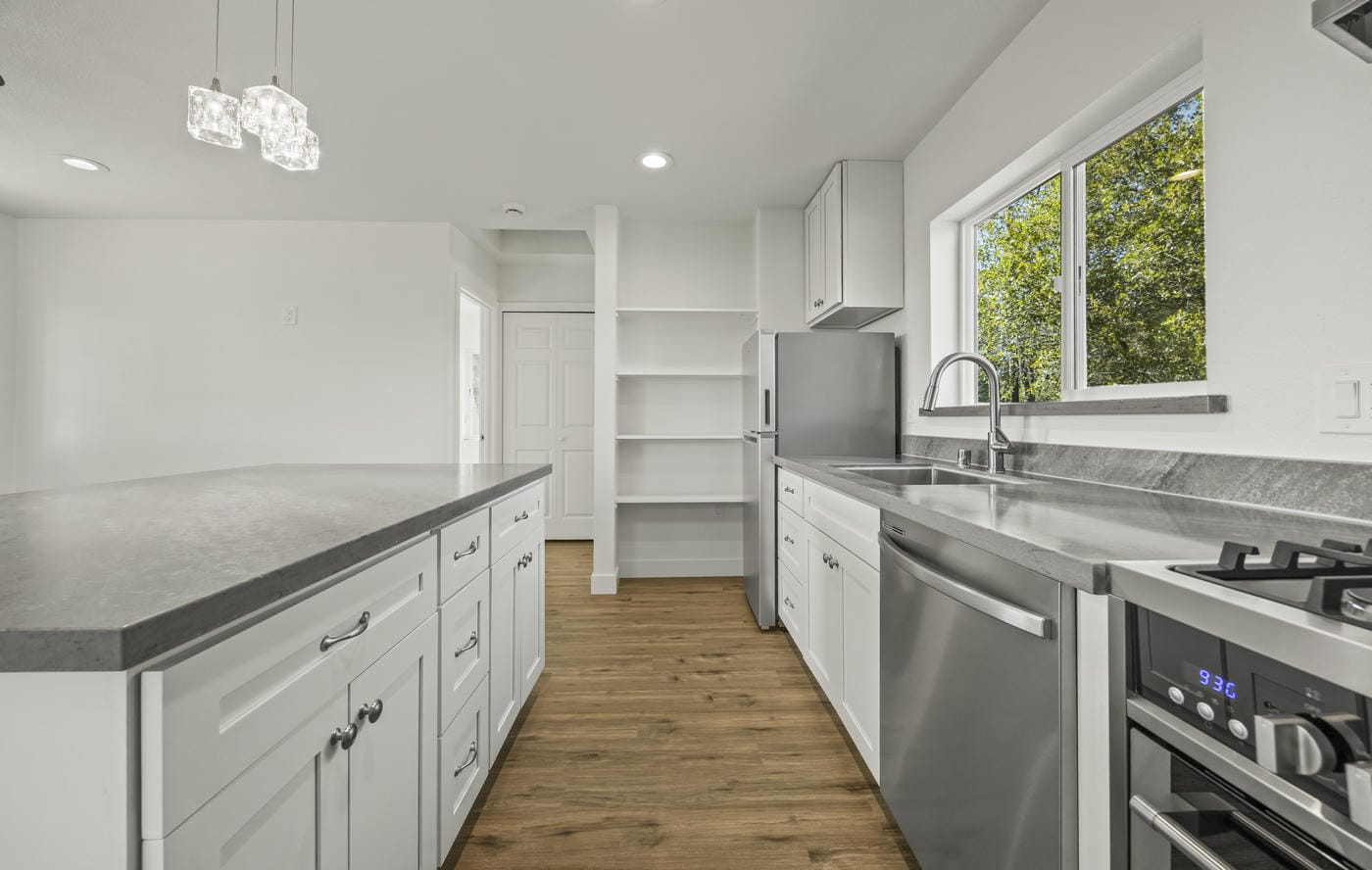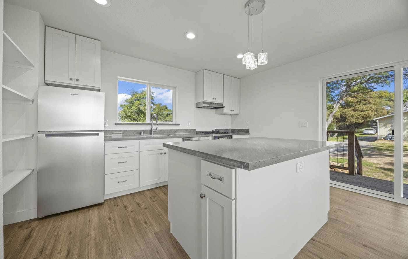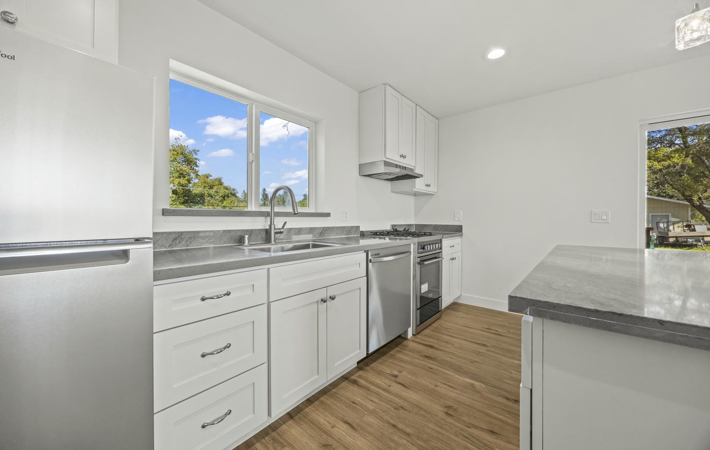 For this project, the homeowners wanted their parents to stay close by but have their own space and privacy. To achieve this, we built this detached ADU complete with its own kitchen, laundry space, full bathroom, livingroom, and covered porch with a view. The space was designed to have wider doorways and hallways to commodate walker or wheelchair use in the space. Our team helped select and furnish the ADU to have a timeless and low maintenance finishes.