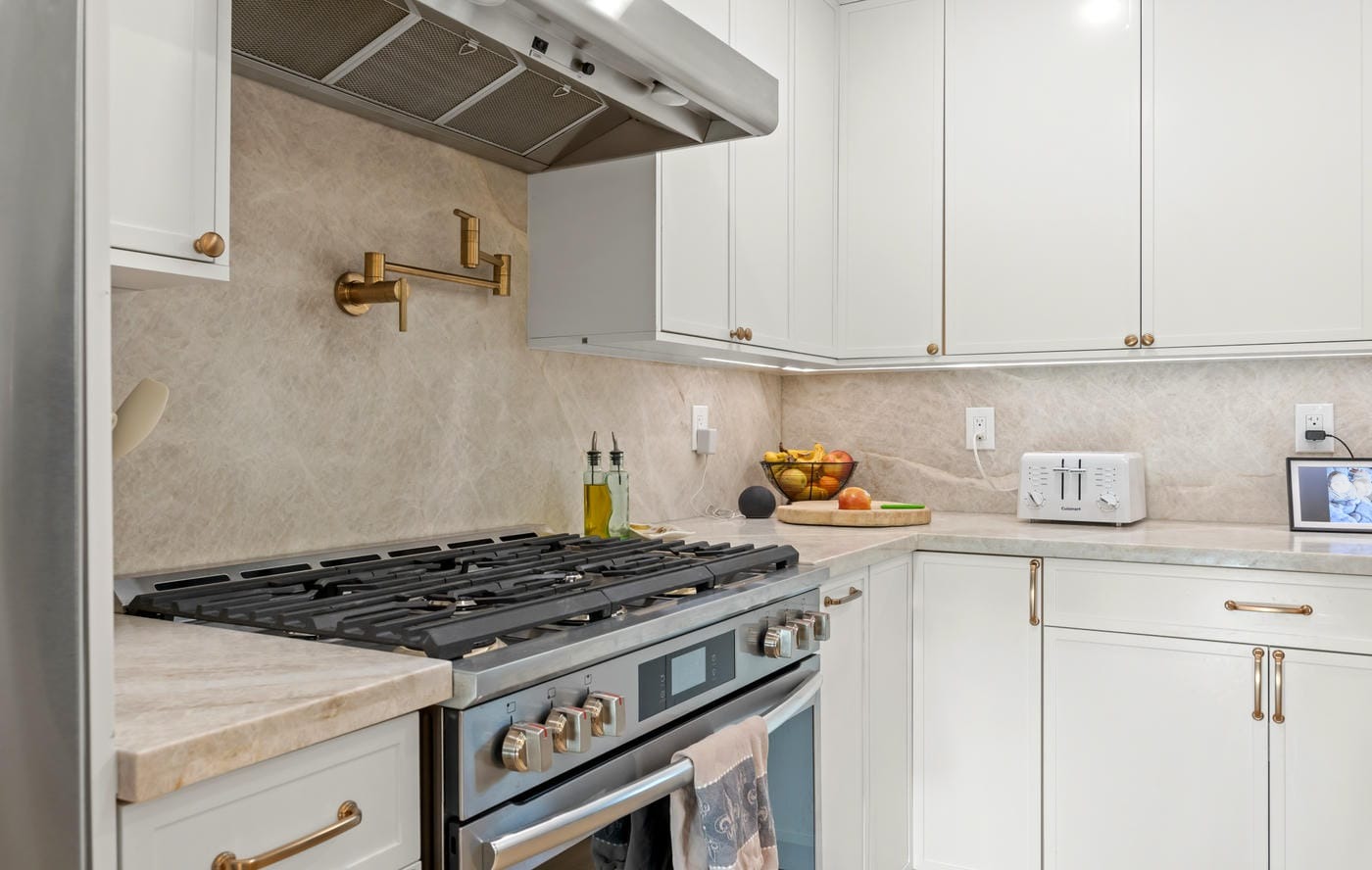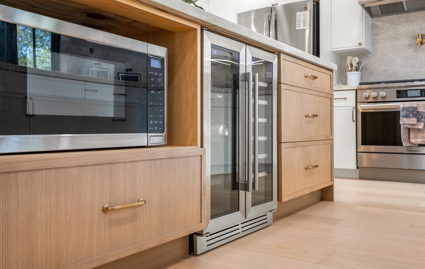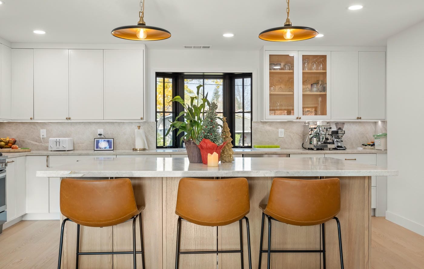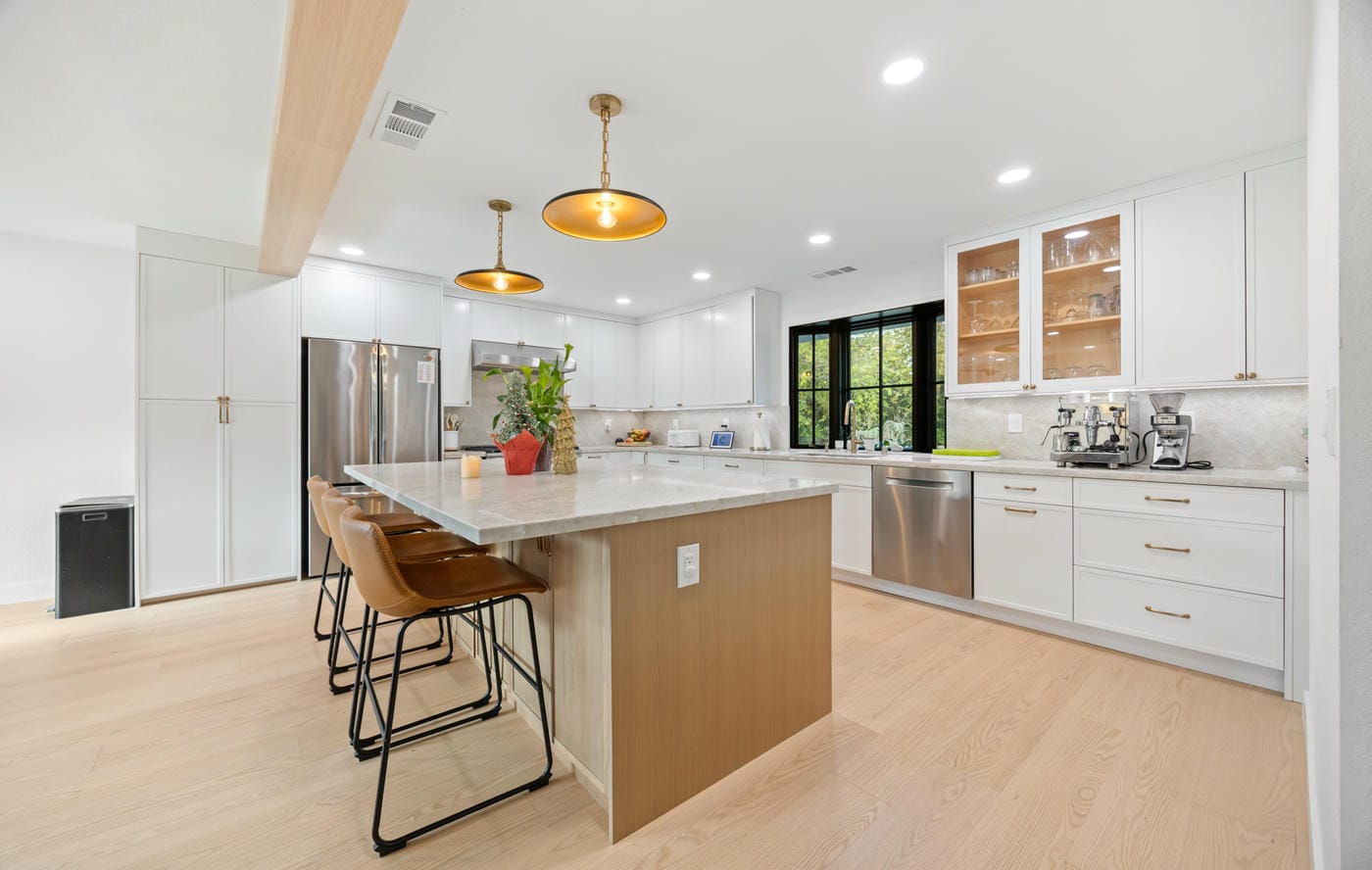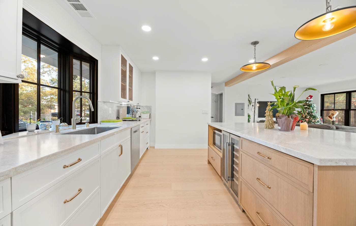 The kitchen finishes were selected by the homeowners. The cabinets used were slim shaker paired with real quartzite countertops and backsplash. The oak center island cabintes and copper light fixtures add a nice touch of character to the space. Other smaller aspects of the projects include the painting of the bedrooms and replacement of electrical fixtures.