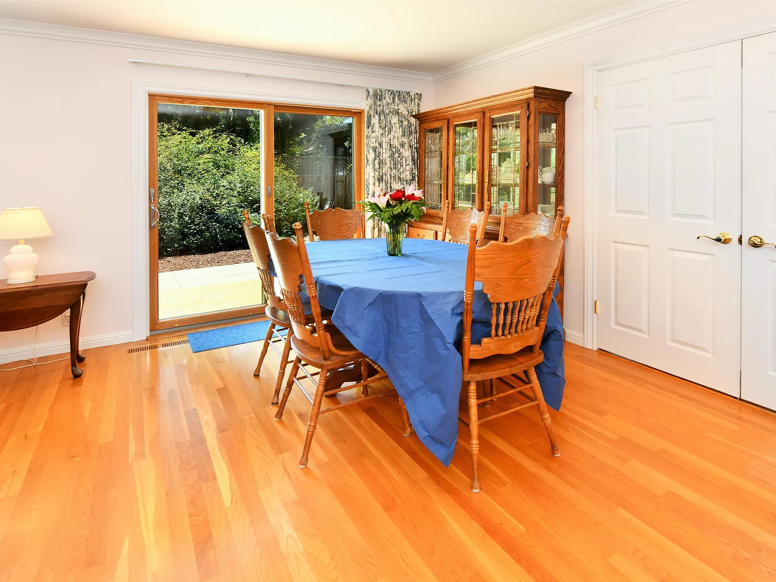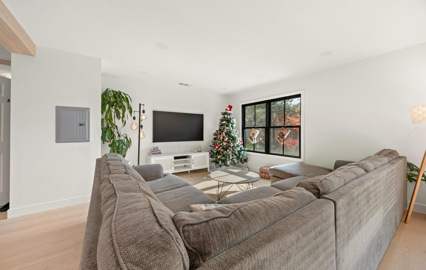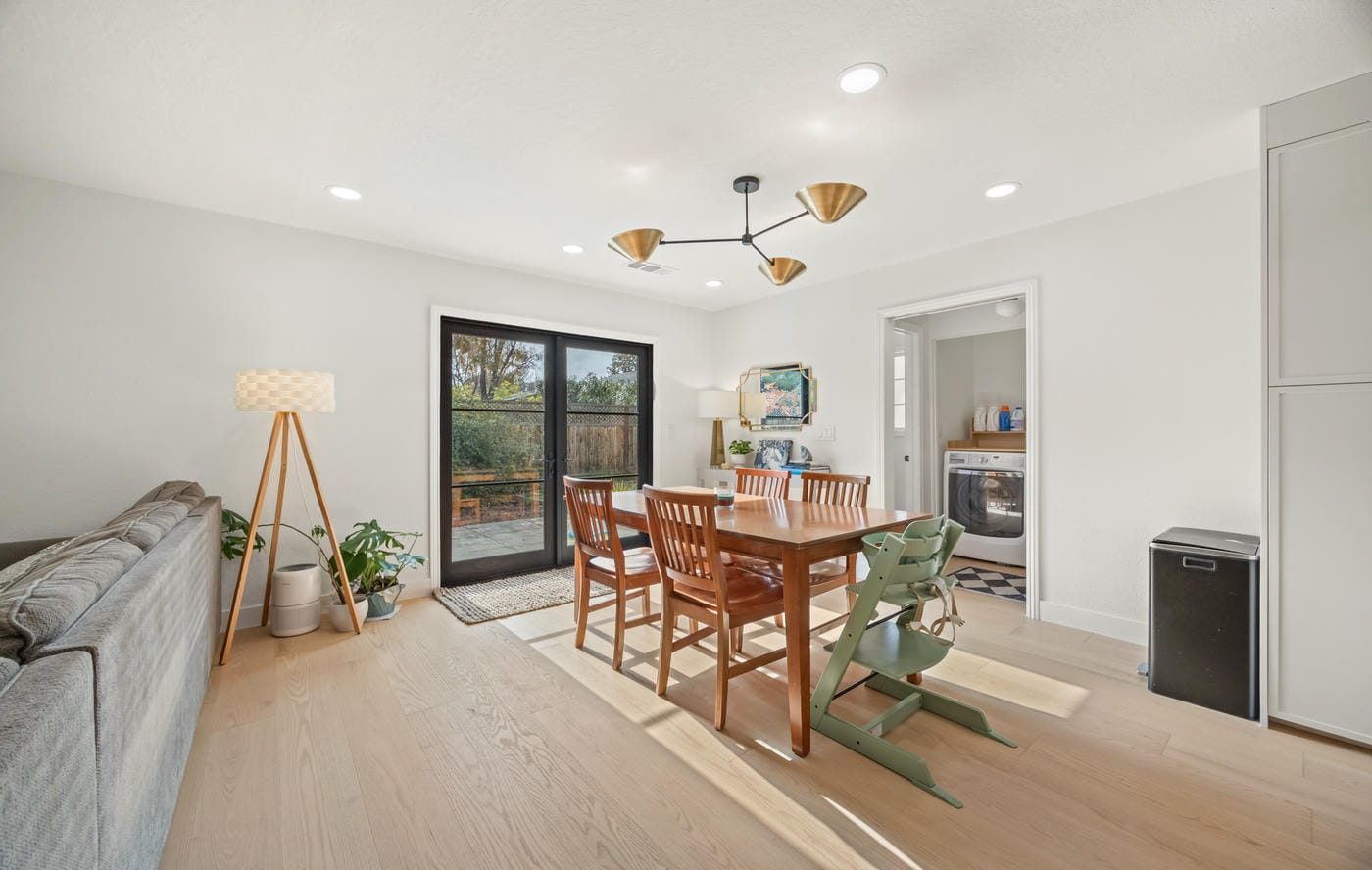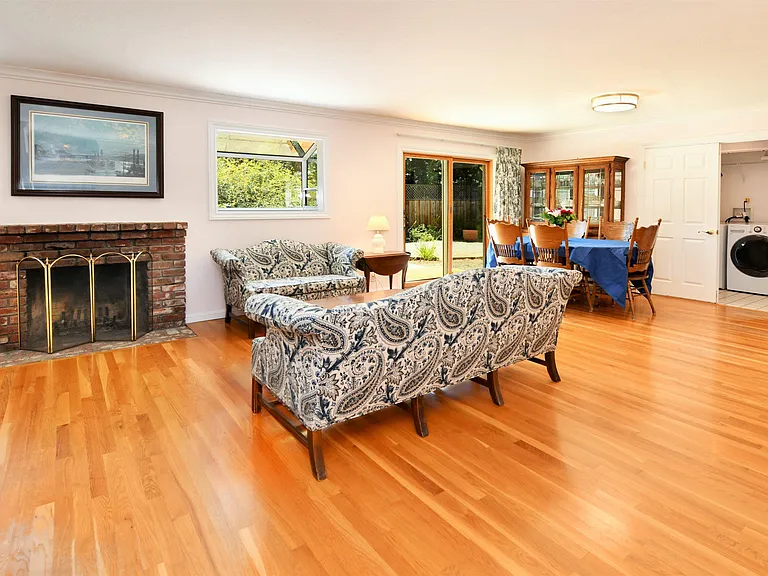 The homeowners had purchased the home and renovated before moving in. You'll notice from the 'before' and 'after' pictures that we removed the center wall that divided the kitchen from the living area. In place of the wall, we installed a PSL beam with an 8" exposure that we wrapped in the same hardwood material used on the floor to limit the number of wood textures and colors present in the space. Additionally, we replace the windows throughout the living area and installed new French doors that open to the backyard. The intention behind this was to create a smooth transition from the indoor to the outdoor living space.