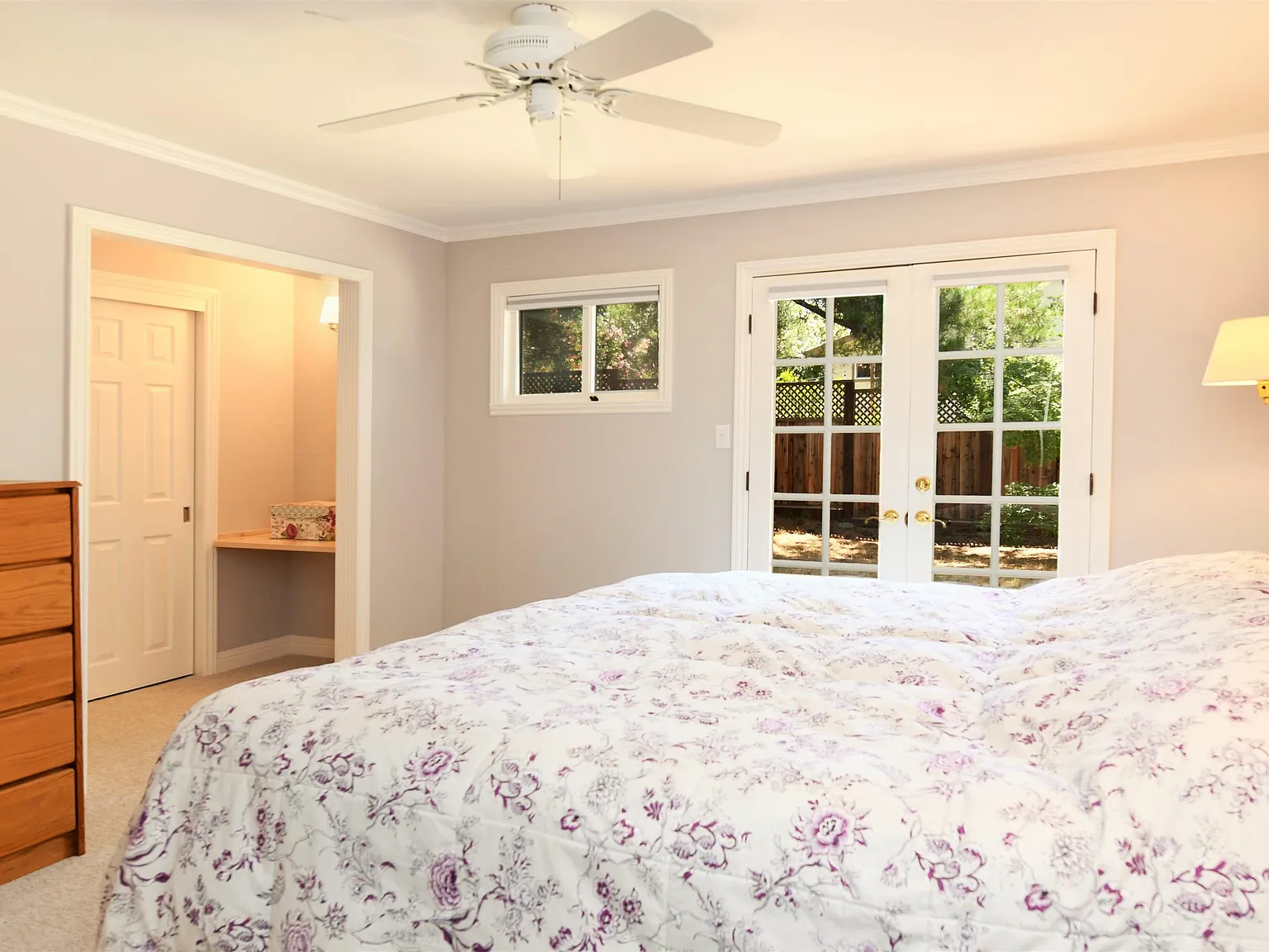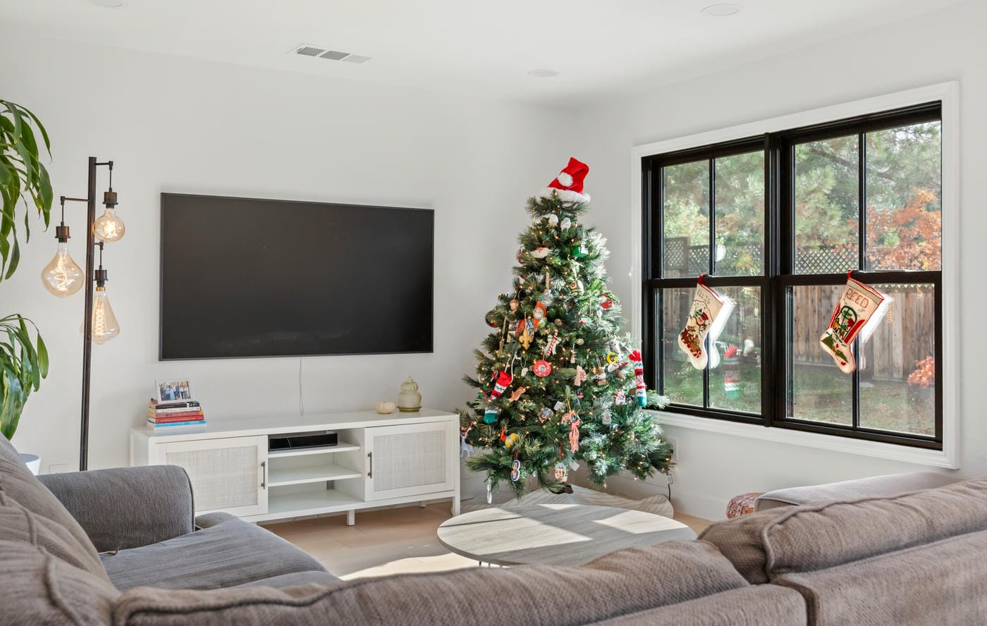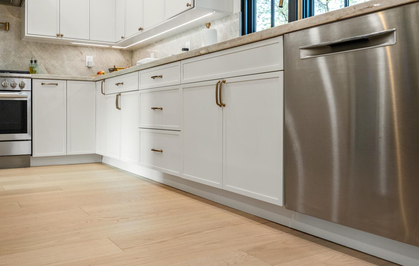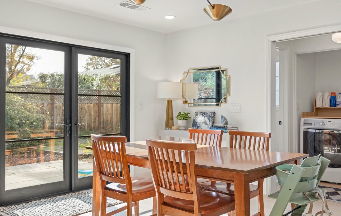 The homeowners had purchased the home and renovated before moving in. You'll notice from the 'before' and 'after' pictures that we removed the center wall that divided the kitchen from the living area. In place of the wall, we installed a PSL beam with an 8" exposure that we wrapped in the same hardwood material used on the floor to limit the number of wood textures and colors present in the space. Additionally, we replace the windows throughout the living area and installed new French doors that open to the backyard. The intention behind this was to create a smooth transition from the indoor to the outdoor living space.