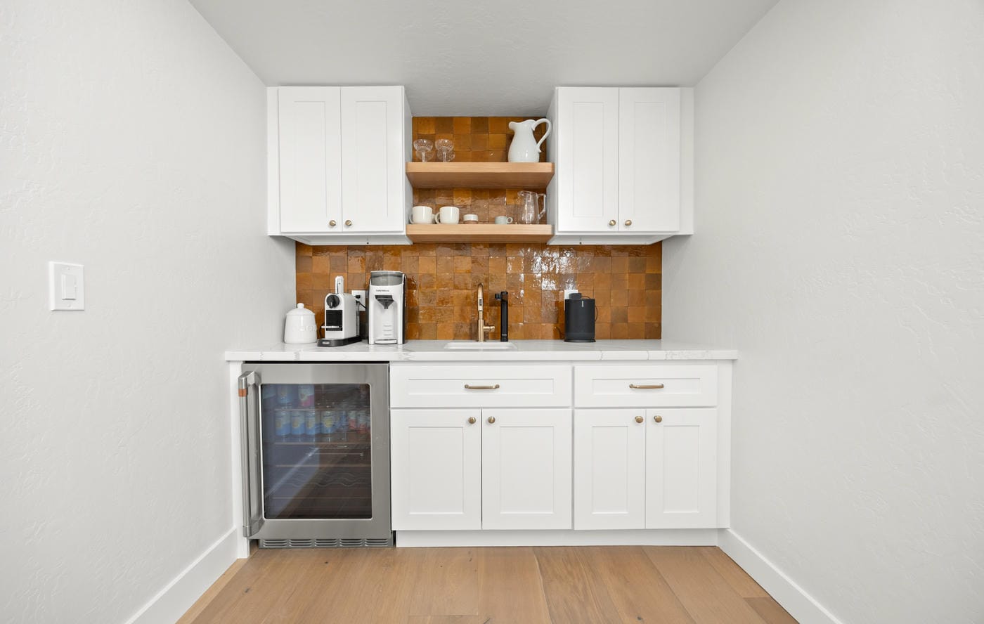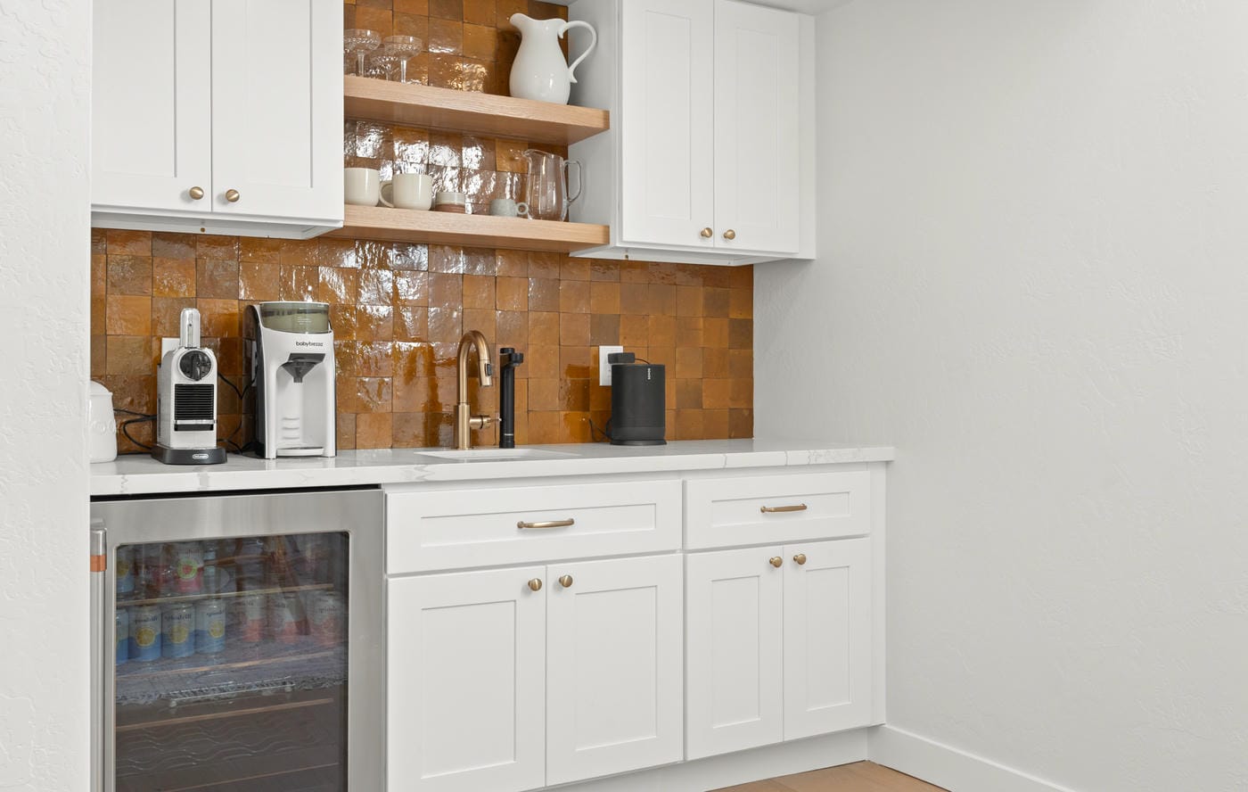 The wet bar is anchored by a hand-cut Moroccan Zellige tile backsplash in a warm amber glaze. Its subtle variation and irregular surface introduce texture and depth, creating a focal point that contrasts with the clean lines of the surrounding cabinetry. Quartz countertops, floating shelves, and a dedicated beverage center complete the space.
