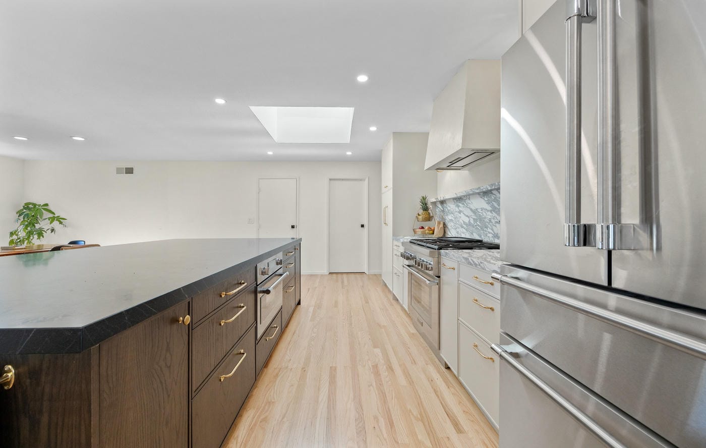 Our designer helped refine the cabinet layout, appliance placement, lighting plan, and overall functionality. We removed the three interior walls enclosing the kitchen, re-framed the opening, and installed a new casement window behind the sink that also serves as a convenient pass-through to the backyard. Water, gas, and electrical systems were rerouted and updated throughout, including new dedicated circuits to support the reconfigured layout.